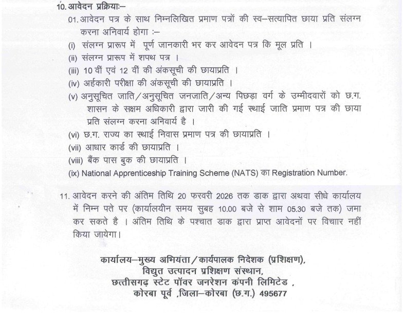 इसके आधिकारिक अधिसूचना में छत्तीसगढ़ राज्य विद्युत उत्पादन निगम के 2026 के प्रशिक्षु भर्ती कार्यक्रम के बारे में विस्तार पूर्वक सूचना दी गई है। आवेदकों की सुविधा के लिए CSPGCL Apprentice Bharti Notification का पीडीएफ डाउनलोड लिंक नीचे उपलब्ध है।